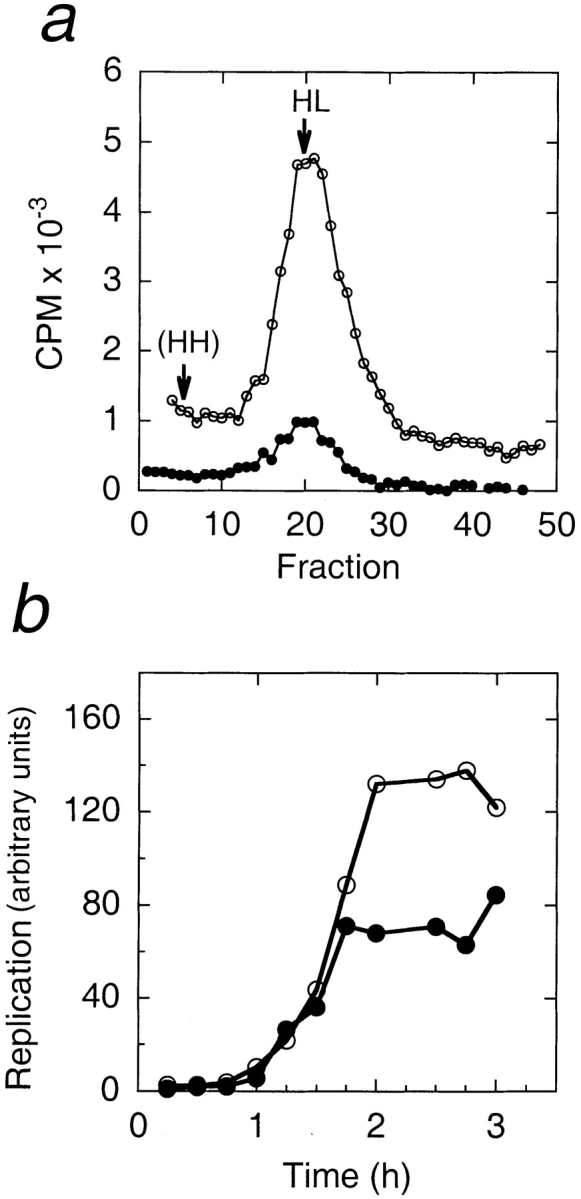 Figure 8. BrdU density substitution experiment, and replication time course. (a) Density substitution experiment. Nuclei were assembled for 2 h in reactions containing BrdU and α[32P]dCTP, in the presence or absence of 3.3 μM fragment 1–408. The substituted DNA was purified and separated by centrifugation on equilibrium CsCl gradients (see Materials and Methods). Replicated DNA (cpm of incorporated α[32P]dCTP) in each gradient fraction is plotted against gradient fractions, which had equal densities as determined by refractive index measurements. HL indicates the density of heavy–light DNA (1.746 g/ml), and HH the expected density of heavy–heavy DNA (1.80 g/ml; Walter et al., 1998). Filled circles indicate reactions lacking LAP2; open circles indicate reactions containing 3.3 μM LAP2 fragment 1–408. (b) Replication time course. Nuclei were assembled in reactions containing α[32P]dCTP, in the presence or absence of fragment 1–408. Aliquots were removed every 15 min for 3 h, and processed by running purified DNA on agarose gel, and quantitating the incorporated [32P]dCTP by PhosphorImager (see Materials and Methods). Filled circles indicate reactions lacking LAP2; open circles indicate reactions containing 3.3 μM LAP2 fragment 1–408.