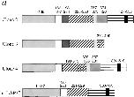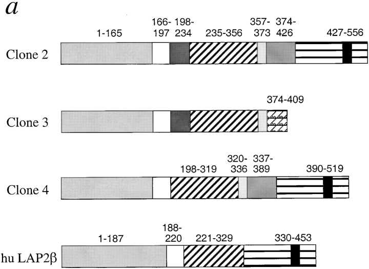 Figure 9. Comparison of predicted Xenopus LAP2 proteins to human LAP2β. (a) Schematic diagrams of translated Xenopus cDNAs and human LAP2β protein. Homologous regions between Xenopus and human LAP2 proteins are shaded similarly. Numbers denote residues that begin and end each block of homology. The black box in the striped COOH-terminal region denotes the predicted transmembrane span. The predicted masses of the proteins encoded by the Xenopus LAP2 cDNAs are 62.841 kD (clone 2), 46.363 (clone 3), and 58.674 kD (clone 4). DNA sequence data are available from GenBank under accession numbers AF048815 (clone 2), AF048816 (clone 3), and AF048817 (clone 4). (b) Alignment of human LAP2β and Xenopus LAP2-clone 2 proteins using BOXSHADE (see Materials and Methods). Black shading indicates identity, gray shading indicates similarity.