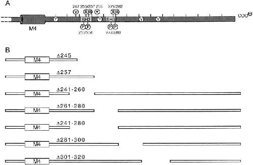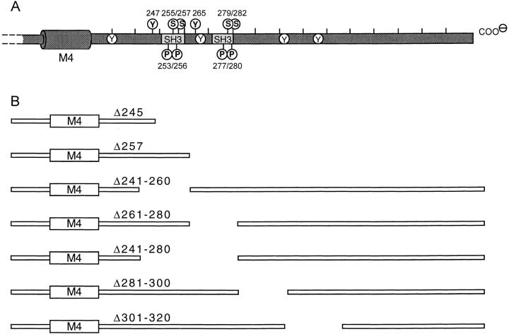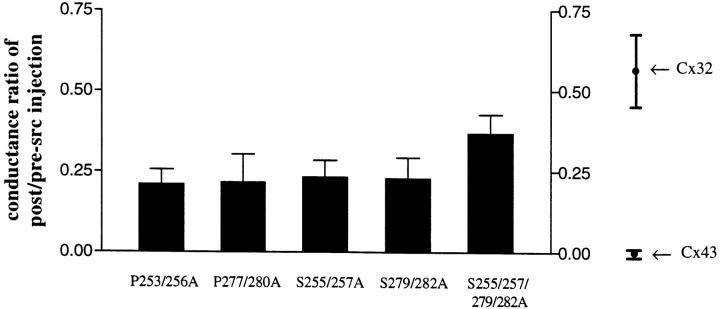 Suppression of gap-junctional communication by various protein kinases, growth factors, and oncogenes frequently correlates with enhanced mitogenesis. The oncogene v-src appears to cause acute closure of gap junction channels. Tyr265 in the COOH-terminal tail of connexin 43 (Cx43) has been implicated as a potential target of v-src, although v-src action has also been associated with changes in serine phosphorylation. We have investigated the mechanism of this acute regulation through mutagenesis of Cx43 expressed in Xenopus laevis oocyte pairs. Truncations of the COOH-terminal domain led to an almost complete loss of response of Cx43 to v-src, but this was restored by coexpression of the independent COOH-terminal polypeptide. This suggests a ball and chain gating mechanism, similar to the mechanism proposed for pH gating of Cx43, and K+ channel inactivation. Surprisingly, we found that v-src mediated gating of Cx43 did not require the tyrosine site, but did seem to depend on the presence of two potential SH3 binding domains and the mitogen-activated protein (MAP) kinase phosphorylation sites within them. Further point mutagenesis and pharmacological studies in normal rat kidney (NRK) cells implicated MAP kinase in the gating response to v-src, while the stable binding of v-src to Cx43 (in part mediated by SH3 domains) did not correlate with its ability to mediate channel closure. This suggests a common link between closure of gap junctions by v-src and other mitogens, such as EGF and lysophosphatidic acid (LPA).