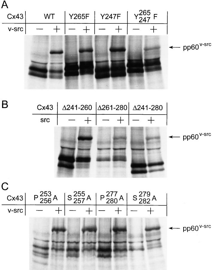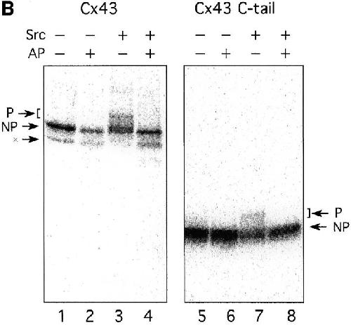 Kanemitsu, Tyrosine phosphorylation of connexin 43 by v-Src is mediated by SH2 and SH3 domain interactions. 1997, Pubmed