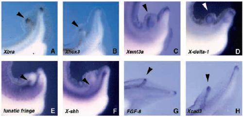 (B) Xhox3 in the distal tail bud, (C) Xwnt3a