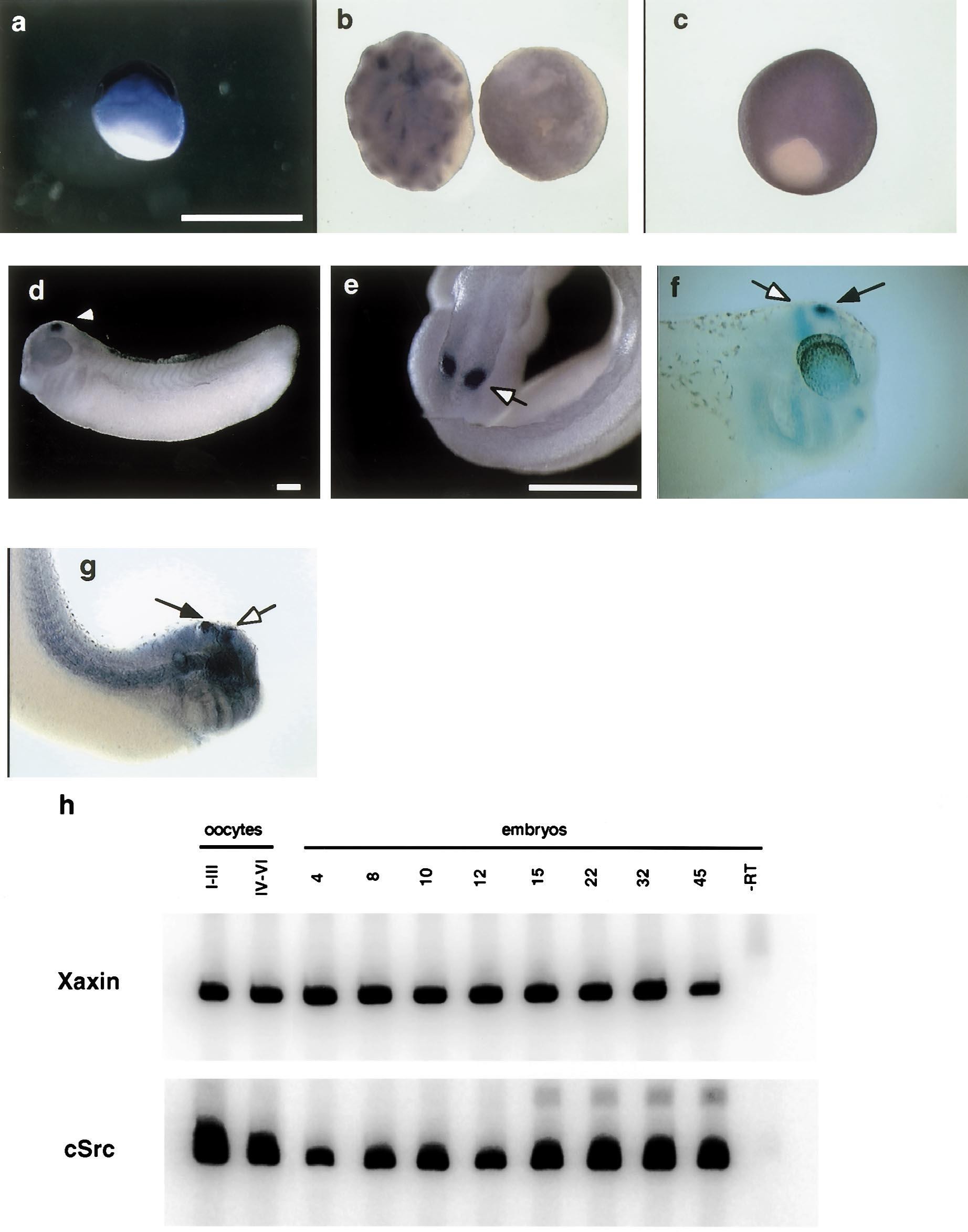 Xaxin (black arrow) and Xwnt-2B (open arrow). (H) Whole oocytes and embryos were subjected to RT-PCR analysis to determine the temporal expression