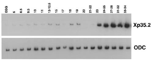 FIG. 3. Developmental expression of Xp35.2. Two micrograms of RNA from developmentally staged embryos was reverse transcribed in