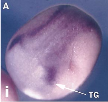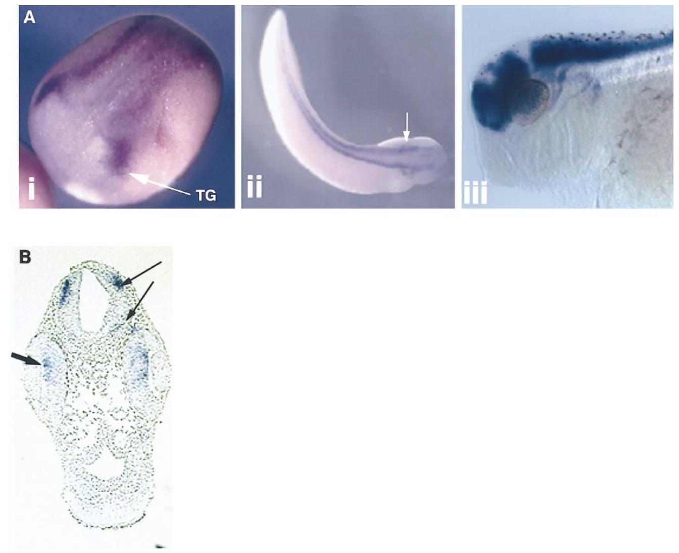 trigeminal ganglion (TG) is highlighted with an arrow. (B) A section through the head of a stage 35/36 embryo where Xp35.2 expression has