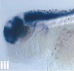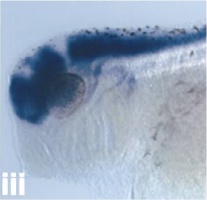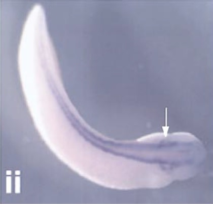 of neural plate stage, (Aii) dorsal view of early tailbud, and (Aiii) lateral view of the head of a late tailbud-staged embryo. Staining of the