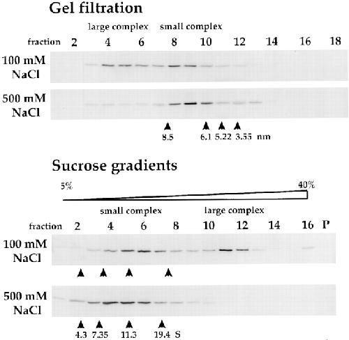 Figure 1. Hydrodynamic analysis of γ-tubulin in concentrated Drosophila embryo extracts. (Top) γ-tubulin immunoblots of Superose 6 gel filtration column fractions in buffer containing 100 μM GTP and 100 or 500 mM NaCl. Calibration standards for the Superose 6 column: bovine thyroglobulin (Stokes radius = 8.5 nm), horse spleen ferritin (6.1 nm), bovine liver catalase (5.22 nm), and bovine serum albumin (3.55 nm), as indicated with arrowheads. (Bottom) γ-tubulin immunoblots of 5–40% sucrose gradient fractions in buffer containing 100 μM GTP and 100 or 500 mM NaCl. Gradients were sedimented at 50,000 rpm for 4 h in an SW55 rotor at 4°C and fractionated from the top; gradient pellets are also shown (P). The peak locations of standards run on parallel gradients are indicated with arrowheads. Sucrose gradient standards: bovine serum albumin (4.3 S), rabbit muscle aldolase (7.35 S), bovine liver catalase (11.3 S), and porcine thyroglobulin (19.4S).