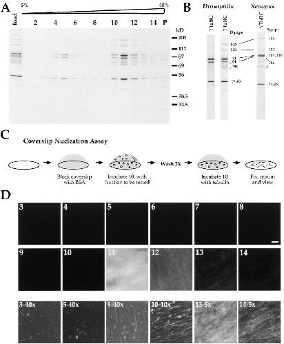 Figure 3. Characterization of γ-tubulin–containing complexes isolated from Drosophila embryo extracts. γ-tubulin–containing complexes were immunoisolated and fractionated by sucrose gradient sedimentation in 100 mM NaCl. (A) 75 μl of each sucrose gradient fraction was TCA precipitated and analyzed by 10% SDS-PAGE and Coomassie staining. The sucrose gradient load is also shown. Peak fractions for standards run on a parallel gradient were: BSA (4.3 S), fraction 2.7; aldolase (7.35 S), fraction 4.0; catalase (11.3 S), fraction 5.6; and bovine thyroglobulin (19.4 S), fraction 8.0. (B) Protein profiles of γTuRC and γTuSC. γTuSC consists of the three most prominent bands in γTuRC. The profile of Drosophila γTuRC resembles that of Xenopus γTuRC (Zheng et al., 1995). (C) Schematic of the coverslip nucleation assay. The coverslip is washed and blocked with a BSA-containing buffer, incubated with the sample to be tested, rinsed to remove unbound protein, incubated with a mixture of unlabeled and rhodamine-labeled tubulin, fixed, and viewed using fluorescence microscopy. (D) Analysis of sucrose gradient fractions in A using the coverslip assay. The top two rows are equivalent exposures for fractions 3–14. The bottom row shows longer exposures (either 40× or 5× longer, as indicated) for some fractions. Bar, 10 μm.