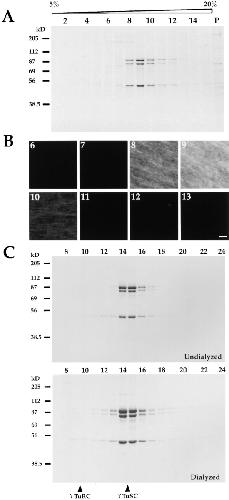 Figure 5. Characterization of the γTuSC. (A) Immunoisolated γTuSC was fractionated on a 5–20% sucrose gradient in buffer containing 500 mM NaCl. Fractions were separated by SDS-PAGE on a 10% gel and stained with Coomassie blue. A standards gradient was run in parallel. Peak fractions for standards were: BSA (4.3 S), fraction 4.9; aldolase (7.35 S), fraction 7.5; and catalase (11.3 S), fraction 10.8. (B) Fractions from the gradient in A were dialyzed against buffer containing 100 mM NaCl and tested in the coverslip assay. Bar, 10 μm. (C) γTuSC from the sucrose gradient in 500 mM NaCl was fractionated by Superose 6 gel filtration in 500 mM NaCl (top), or was first dialyzed against buffer containing 100 mM NaCl and then fractionated by Superose-6 gel filtration in buffer containing 100 mM NaCl (bottom). Standards of known Stokes radius were used to calibrate the column. The peak fractions for the gel filtration standards were: bovine thyroglobulin (8.5 nm), fraction 13.5; horse spleen ferritin (6.1 nm), fraction 15.4; bovine liver catalase (5.22 nm), fraction 16.9; aldolase (4.81 nm), fraction 17.1; ovalbumin (3.05 nm), fraction 18.0; and chymotrypsinogen (2.09 nm), fraction 20.0.