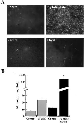 Figure 6. Comparison of the nucleating activity of peptide-eluted complexes and isolated γTuSC. (A) Representative fields from solution nucleation assays. Bar, 20 μm. (B) Quantitation of solution nucleation assays. MTs in 10 microscope fields were counted and the average number of MTs/field is plotted. Error bars represent the SEM.