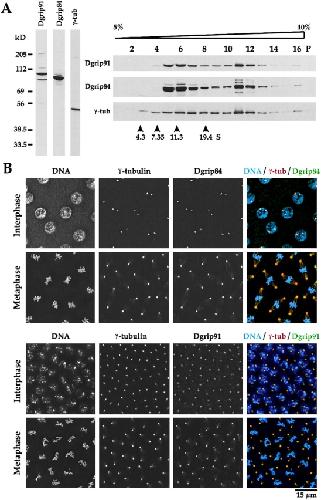 Figure 7. Dgrip91 and Dgrip84 associate and colocalize with γ-tubulin. (A) Clarified Drosophila embryo extract was immunoblotted for Dgrip91, Dgrip84, and γ-tubulin after separation on 10% SDS-PAGE gels (left). Each antibody recognizes a band of the expected molecular weight. Both Dgrip91 and Dgrip84 comigrate with γ-tubulin on sucrose gradients of embryo extract (right). (B) Immunofluorescence of early Drosophila embryos with antibodies against Dgrip91, Dgrip84, and γ-tubulin. Both Dgrip84 (top) and Dgrip91 (bottom) localize to centrosomes and to the mitotic spindle in a fashion that is indistinguishable from the localization of γ-tubulin. Examples of embryos in interphase and mitosis are shown for each antibody. Bar, 15 μm.
