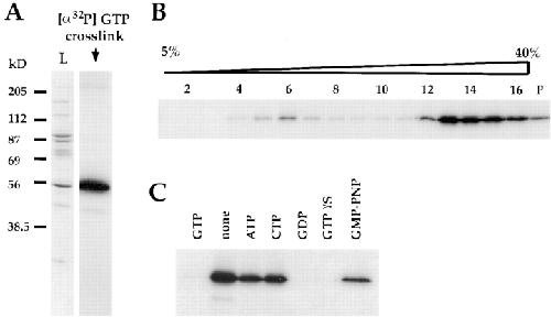 Figure 8. Photo cross-linking of radiolabeled GTP to γ-tubulin in γTuSC and γTuRC. (A) GTP cross-linking of peptide-eluted complexes. γ-tubulin is the only protein that cross-links to GTP. (B) GTP cross-linking after sucrose gradient fractionation of the material in A, demonstrating that γ-tubulin in both γTuSC and γTuRC cross-links to GTP. (C) Competition of the GTP cross-link of the material in A with 200-fold excess of the indicated unlabeled nucleotides.