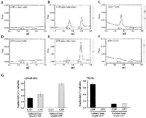 Figure 9. Analysis of nucleotide bound to γ-tubulin in γTuSC, a comparison with αβ-tubulin dimer. Desalting was used to remove free nucleotide from samples of purified γTuSC or αβ-tubulin. Bound nucleotide was released by urea treatment and analyzed on a mono Q column. Arrows indicate the elution positions of GDP and GTP. For samples containing protein (B, C, E, and F), a gel lane of the desalted sample is shown to the right of the UV trace. (A–C) Nucleotide analysis after isolation from buffer containing 20 μM GDP. (A) After desalting of control buffer no nucleotide is detected (the broad peak just to the left of the GDP arrow is a background peak). (B) Both GDP and GTP are bound to αβ-tubulin dimer (for quantitation see Table II: 20 μM GDP, experiment 3). (C) Exclusively, GDP binds to γ-tubulin in γTuSC (for quantitation see Table II: 20 μM GDP, experiment 3). (D–F) Nucleotide analysis after isolation from buffer containing 20 μM GTP. (D) Although GTP is desalted slightly less efficiently than GDP (compare with A), >99.9% of free GTP is removed from control buffer. (E) Exclusively, GTP binds αβ-tubulin dimer (for quantitation see Table II: 20 μM GTP, experiment 1). (F) Small amounts of both GDP and GTP are detected bound to γ-tubulin in the γTuSC (for quantitation see Table II: 20 μM GTP, experiment 1). (G) Summary of nucleotide analysis from three independent experiments (raw data shown in Table II). Bar graphs indicate the ratio of bound nucleotide per αβ-tubulin dimer, or γ-tubulin monomer in γTuSC after isolation from buffers containing 20 μM GDP or 20 μM GTP. Error bars represent the SEM. The ratio of GDP/GTP recovered when we desalt αβ-tubulin dimer from buffer containing GDP is very reproducible (0.733 ± 0.015, n = 5) suggesting that the protein concentration determined by densitometry is the least accurate parameter in this analysis. This ratio also suggests that we are recovering ∼73% of the GDP bound to the β-tubulin E-site.