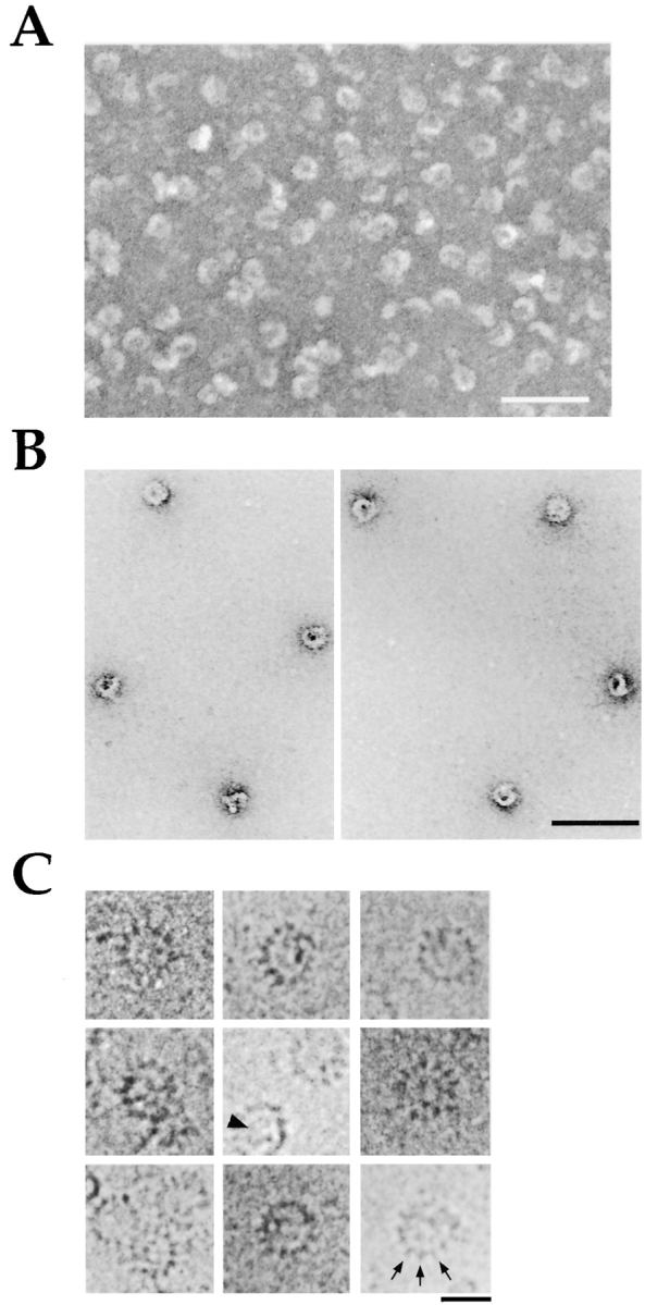 Figure 4. Structure of Drosophila γTuRC. (A and B) Negative stain electron microscopy of the peptide-eluted complexes (A) or of Drosophila γTuRC after isolation on a sucrose gradient (B). Bar, 100 nm. (C) A gallery of cryo-electron microscopy images of Drosophila γTuRC. Cryo-electron microscopy reveals a modular structure with ∼13 structural repeats (arrows) in a radial pattern. The ring has a diameter of ∼25 nm. Some internal structures are also apparent (arrowhead). Bar, 25 nm.