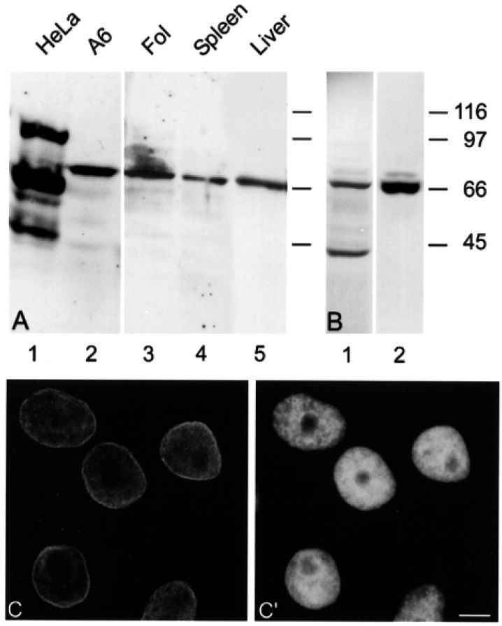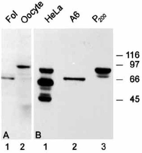 (B) Total cellular proteins of HeLa cells (HeLa, lane 1), Xenopus A6