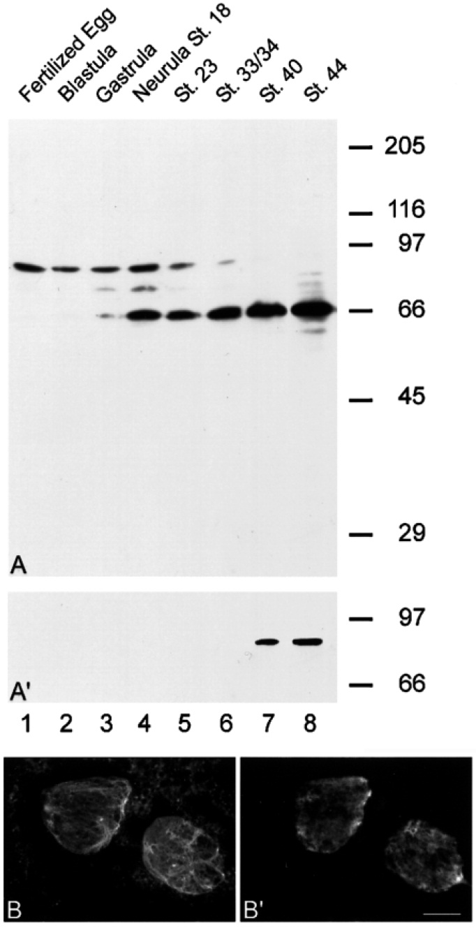 reference proteins (in kDa) are marked in A and B. (C,C¢) Indirect