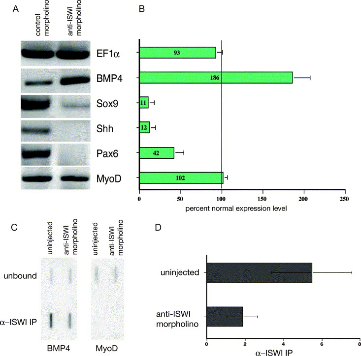 Fig. 3. RT-PCR of tissue-specific genes in anti-ISWI morpholino-injected embryos. Total RNA was collected from embryos at the specified stages and real-time RT-PCR was performed with specific neural gene primers. (A). Products of RT-PCR reactions. EF1α was tested at stages 10, 12, 13, 15, 18 and 20. The stage 13 data is shown and is representative of all stages tested. Other genes shown were analyzed at the following stages: BMP4, stage 10/11; Sox9 and Shh, stage 13; Pax6 and MyoD, stage 15/16; HoxB9, stage 18/20. (B). Quantitative data from real-time RT-PCR, showing the level of expression (as percentages) of each gene compared to the levels in control-injected embryos. Each bar represents the average from a minimum of three injection experiments. Standard errors are shown. (C). Representative slot blots of chromatin immunoprecipitations with anti-ISWI antibody. Chromatin was extracted from stage 12/13 embryos; comparable results were obtained with later stages. Left panel was probed for BMP4, right panel was probed for MyoD. (D). Average enrichment of ISWI at BMP4 in uninjected and anti-ISWI MO-injected embryos (80 ng) (stage 12/13). Standard errors are shown.