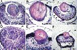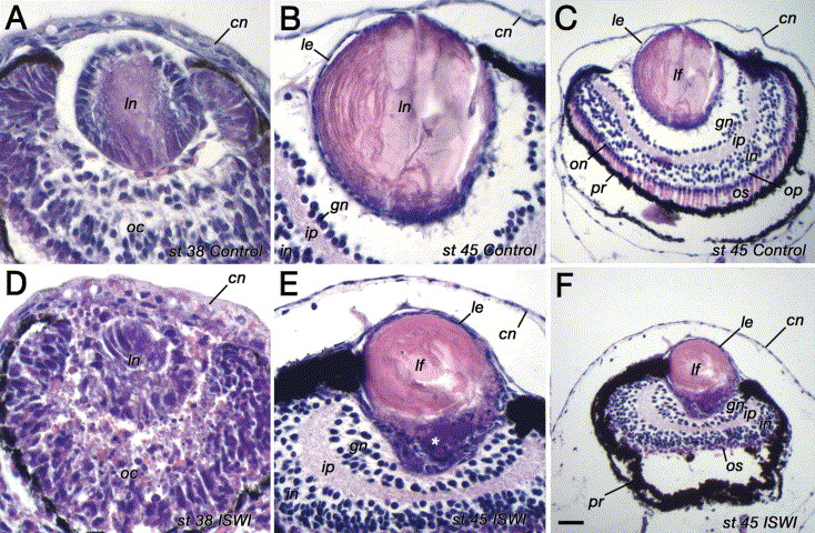 Fig. 5. Cross-sections through normal control and defective eyes in ISWI morpholino knockdown embryos. (A). Normal stage 38 eye showing optic cup, lens and cornea. Note presence of large central, primary lens fiber cell ânucleusâ and additional secondary lens fiber cells at the periphery of the lens. (BâC). Corresponding high and low magnification views of the normal eye in a stage 45 animal. Note large mass of enucleated lens fiber cells and thin nucleated lensepithelium. Also note normal arrangement of differentiated cell layers within the eye cup. D. Stage 38 ISWI morpholino knockdown eye. Note that the lens is more poorly developed compared to (A) and contains a much smaller mass of primary lens fiber cells. Other lens and retinal cells appear to be more highly rounded. EâF. Corresponding high and low magnification views of the stage 45 ISWI morpholino knockdown eye. Note presence of large basophilic, nucleated cell mass (cataract) on the posterior surface of the lens (asterisk). Defects are also apparent in the development of the retinal layers (see text for further details). Cn, cornea; gn, ganglion layer; in, inner nuclear layer; ip, inner plexiform layer; le, lensepithelium; lf lens fiber cells; ln, lens; oc, optic cup; on, outer nuclear layer; op, outer plexiform layer; os, rod and cone outer segments; pr, pigmented retinal epithelium. Scale bar equals 25 μm for AâB and DâE, 50 μm for C and F.