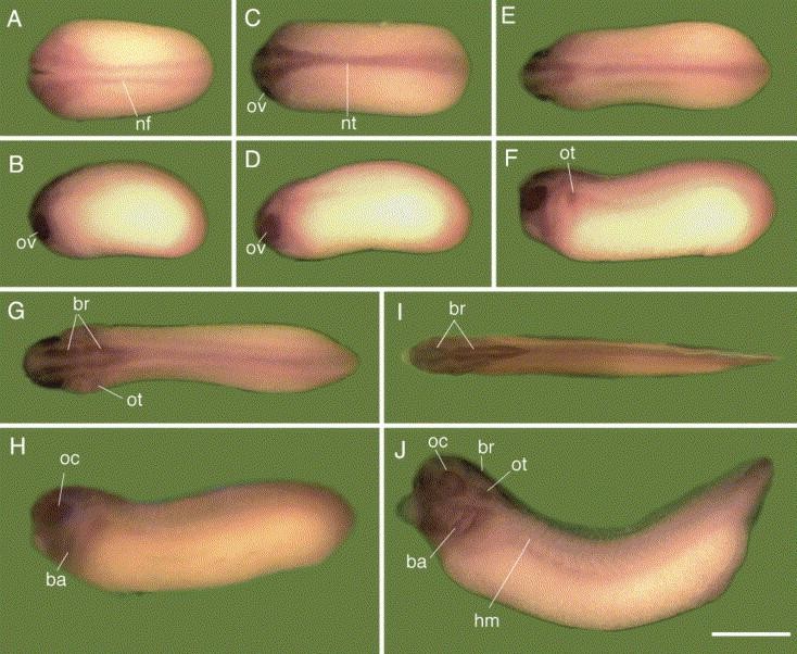 Fig. 1. Whole mount in situ hybridization of Xenopus embryos with a 343Â bp ISWI digoxigenen-labeled probe. AâJ: Corresponding dorsal and leftlateral views of stage 18 (AâB), 24 (CâD), 26 (EâF), 28 (GâH) and 33 (IâJ) embryos showing expression of ISWI in regions of the neural tube, brain, and optic vesicles. All embryos are oriented with the anterior end towards the left side of the figure. nf, neural fold; nt, neural tube; ov, optic vesicle; ot, otic vesicle; oc, optic cup; br, brain; ba, brachial arches; hm, hypaxial muscles. Scale bar equals 1Â mm.