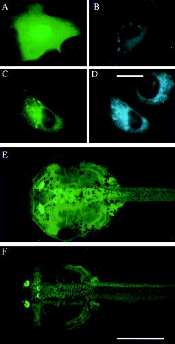 The subcellular localization of GFP and GFP-D3 proteins in X. laevis XTC cells and the expression pattern of transgenic animals. (A) GFP fluorescence in transfected XTC cell. (B) ER-Tracker fluorescence of the same cell shown in A. (C) GFP-D3 fluorescence in transfected cell next to untransfected cell. (D) ER-Tracker fluorescence of the same cells shown in C. (Bar = 20 μm, A–D.) (E) GFP fluorescence of a 2-wk-old pCS2+GFP transgenic animal. (F) GFP fluorescence of a 2-wk-old pCS2+GFP-D3 transgenic animal expressing high levels of GFP-D3. (Bar = 2 mm, E and F.)