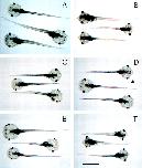 Tadpoles overexpressing GFP-D3 are resistant to exogenous T3. One-week-old tadpoles were screened by using GFP fluorescence and treated with 10 nM T3 for 1 wk. The reshaping of their heads and the protrusion of the lower jaw are the most obvious TH-induced changes. (A) Normal fertilized animals, no T3. (B) Normal fertilized animals treated with T3. (C) pCS2+GFP-D3 transgenic animals, no T3. (D) pCS2+GFP-D3 transgenic animals treated with T3. The arrowhead points to an animal showing partial response as evidenced by slight protrusion of the lower jaw. (E) Nontransgenic siblings, no T3. (F) Nontransgenic siblings treated with T3. (Bar = 4 mm.)
