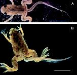 Tailed transgenic frog overexpressing GFP-D3. The animal having just completed gill resorption (A) and the same animal 2 months later (B). (Bar = 1 cm.)
