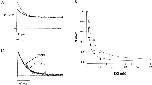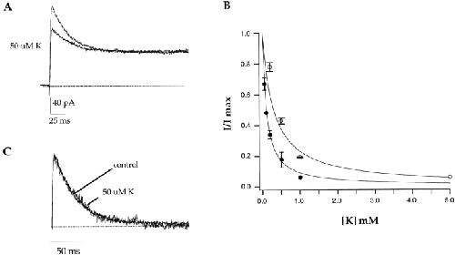 Figure 6. External potassium blocks sodium currents in A463C with a high affinity but does not slow C-type inactivation. Data shown in A were obtained from an outside-out patch in the presence of external NMG+ and internal Na+. Currents were elicited by voltage steps to +100 mV and externally applied potassium blocked the observed currents in a concentration-dependent manner (A). The data were quantified by measuring percent current remaining (I/Imax) at +100 mV versus the external potassium concentration (B, •). The error bars represent the SEM. A fit to the data with a single binding isotherm yields a Kd value of 100 μM. The empty symbols represent the identical experiment except that it was performed in the presence of symmetrical sodium. Currents were elicited by voltage steps to +100 mV or by voltage ramps from −100 to +200 mV (data not shown). The blocking data were identical regardless of the voltage protocol used and as a result it was pooled. The error bars represent the SEM. A fit to the data with a single binding isotherm yields a Kd value of 300 μM. (C) The control current and the current in the presence of 50 μM external potassium from A were scaled in amplitude and the baselines were subtracted. No change in the C-type inactivation rate is observed in the presence of 50 μM external potassium.