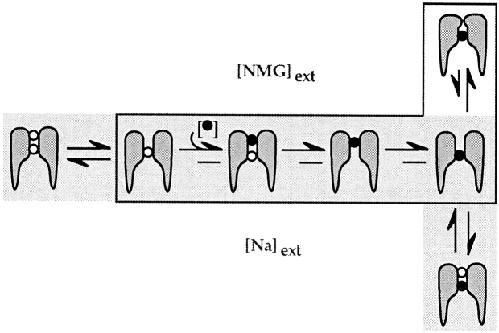 Figure 7. State diagram model of external potassium block of sodium currents in A463C. Sodium ions are represented by ○, while potassium ions are shown as •. (Outlined scheme) In the presence of external NMG+, external potassium first binds to the C-type inactivation site but proceeds to a deeper, higher affinity site in the pore. The occupancy of the deeper site by potassium does not interfere with the onset of C-type inactivation. (Shaded scheme) In the presence of external Na+, external potassium must first displace the bound sodium ion before it can proceed to the deeper site. After the higher affinity site is reached, the external (C-type) site is refilled by a sodium ion.