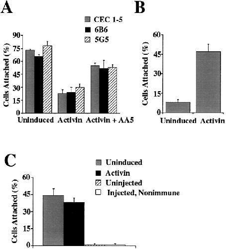 Figure 5. Activin regulation of blastomere attachment to anti– C-cadherin mAbs. (A) Attachment of uninduced, activin-induced, or activin-induced and mAb AA5-treated blastomeres to substrates coated with CEC1-5, anti–C-cadherin mAb 6B6, or anti–C-cadherin mAb 5G5. (B) Uninduced and activin-induced blastomere attachment to fibronectin. (C) Attachment of uninduced and activin-induced blastomeres expressing an IL-2β receptor–C-cadherin cytoplasmic tail fusion protein to substrates coated with anti–IL-2β receptor mAbs.