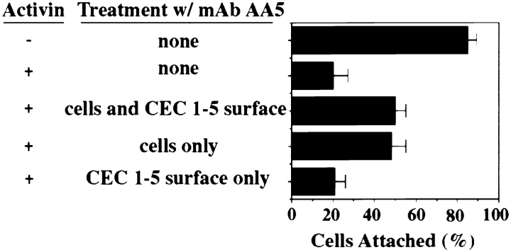 Figure 6. mAb AA5 activates cell-associated C-cadherin only. The ability of mAb AA5 to activate C-cadherin adhesion was determined after its addition to different components of the cell attachment assay. It was added either to the complete attachment assay (as in Fig. 2), to the CEC1-5–coated substrate alone (rinsed), or to the blastomeres alone (rinsed).