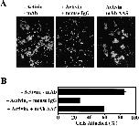 Figure 2. mAb AA5 enhances the C-cadherin–mediated adhesion of activin-induced animal cap blastomeres. (A) Blastomere aggregation assay. Dissociated blastomeres were treated with or without activin (5 ng/ml). Activin-treated blastomeres were incubated either with mAb AA5 Fab (1 μg/ml) or nonimmune mouse IgG Fab (1 μg/ml) in the presence of calcium, and then allowed to aggregate with constant shaking for 15 min. (B) Blastomere adhesion to CEC1-5. Dissociated blastomeres were treated with or without activin. Activin-treated blastomeres were incubated with either mAb AA5 Fab or nonimmune mouse IgG Fab, and then allowed to attach to spots of CEC1-5 protein coated on a tissue culture plate in the presence of calcium for 30 min. The plates were then shaken continuously for 2 min on a horizontal shaker and the numbers of blastomeres per unit area remaining attached were counted. The graph shows the results of three different experiments, each performed in duplicate.