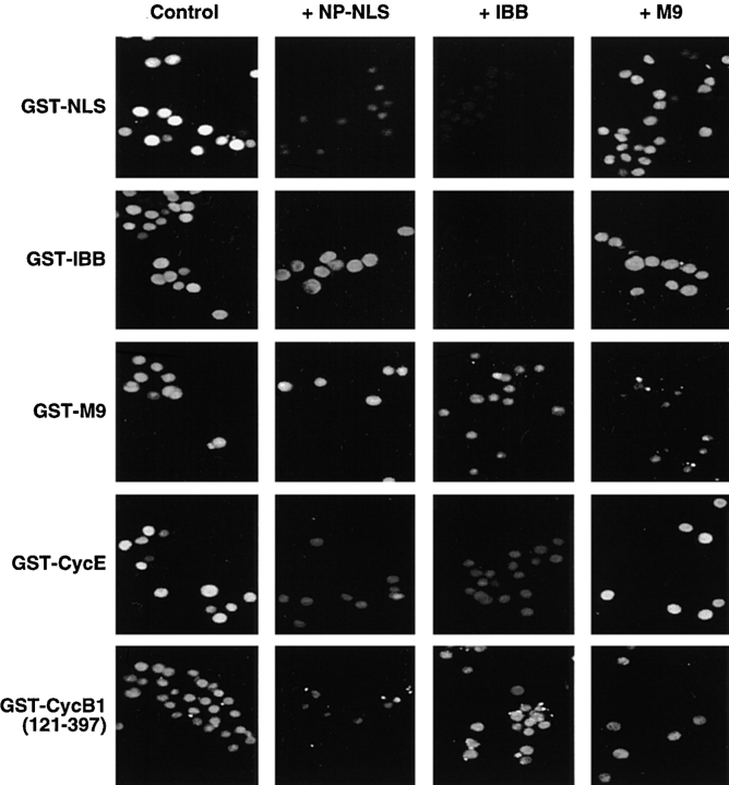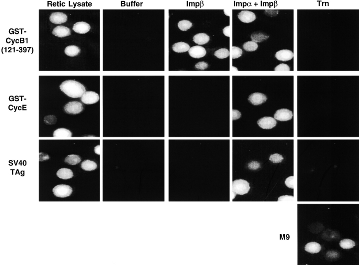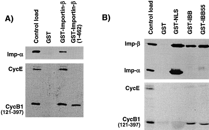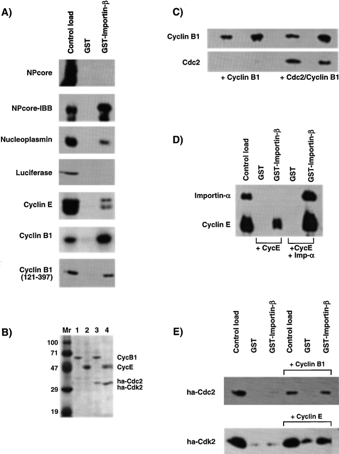 Reversible phosphorylation of nuclear proteins is required for both DNA replication and entry into mitosis. Consequently, most cyclin-dependent kinase (Cdk)/cyclin complexes are localized to the nucleus when active. Although our understanding of nuclear transport processes has been greatly enhanced by the recent identification of nuclear targeting sequences and soluble nuclear import factors with which they interact, the mechanisms used to target Cdk/cyclin complexes to the nucleus remain obscure; this is in part because these proteins lack obvious nuclear localization sequences. To elucidate the molecular mechanisms responsible for Cdk/cyclin transport, we examined nuclear import of fluorescent Cdk2/cyclin E and Cdc2/cyclin B1 complexes in digitonin-permeabilized mammalian cells and also examined potential physical interactions between these Cdks, cyclins, and soluble import factors. We found that the nuclear import machinery recognizes these Cdk/cyclin complexes through direct interactions with the cyclin component. Surprisingly, cyclins E and B1 are imported into nuclei via distinct mechanisms. Cyclin E behaves like a classical basic nuclear localization sequence-containing protein, binding to the alpha adaptor subunit of the importin-alpha/beta heterodimer. In contrast, cyclin B1 is imported via a direct interaction with a site in the NH2 terminus of importin-beta that is distinct from that used to bind importin-alpha.
