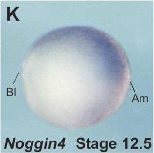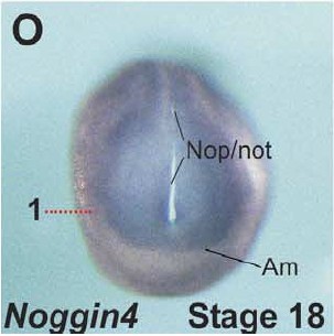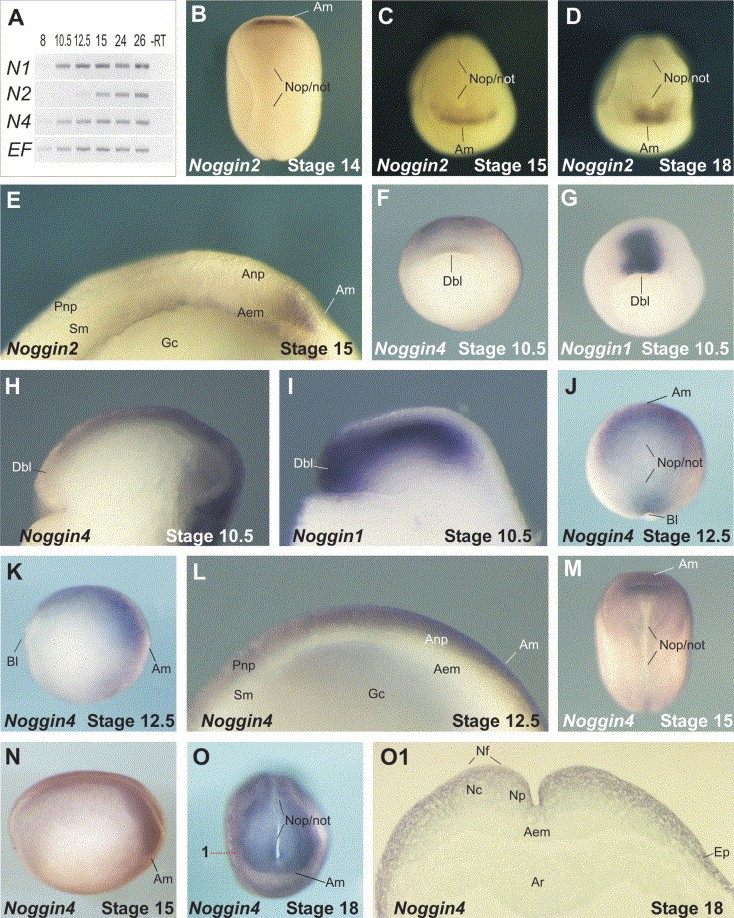 Fig. 2. Expression of the X. laevis noggins at the stages 10,5â18. (A) Results of RT-PCR of the total RNA from embryos at the indicated stages with primers to noggin1 (N1), noggin2 (N2), noggin4 (N4) and EF-1-alpha (EF) as the loading control. (B-O) Results of the whole-mount in situ hybridization. The embryos are shown from the dorsal side (B, J and M), from the anterior, dorsal side upward (C, D and O), from the vegetal pole, dorsal side upward (F and G), from the right side, dorsal side upward (K, N), split sagittally, anterior to the right (E, L). (O1) Histological frontal section of the embryo shown on (O) at the level indicated by red dotted line. Abbreviations: Aemâanterior endomesoderm; Amâanterior margin of the neural plate; Anpâanterior neural plate; Arâarchenteron roof; Blâblastopore; Dblâdorsal blastopore lip; Epâepidermis; Gcâgastrocoel; Ncâpresumptive neural crest; Nfâneural fold; Nopâneural plate; Np/notânotoplate/notochord; Pnpâposterior neural plate; Smâpresumptive somites.