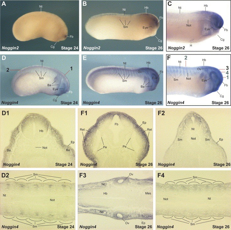 Fig. 3. Expression of the X. laevis noggins at the stages 24 and 26. (AâF) Results of the whole-mount in situ hybridization. All embryos are shown from the right side, anterior to the right, dorsal upward. Embryos shown on C and F were cleared in the mixture of benzyl benzoate and benzyl alcohol. (D1âF4) Histological sections of embryos hybridized in whole-mount. (D1 and D2) Sections of embryos at stage 24 at the levels indicated on (D). (F1âF4) Sections of embryos at stage 26 at the levels indicated on (F). On D1, F1 and F2, dorsal to the top; on D2, F3 and F4, anterior to the right. Abbreviations: Baâbranchial arches; Cgâcement gland; Fbâfore brain; Hâheart; Hbâhind brain; Mesâmesencephalon; Ncâneural crest cells; Ntâneural tube; Notânotochord; Ovâotic vesicle; Peâpresumptive pigmented epithelium; Retâretina; Smâsomites.