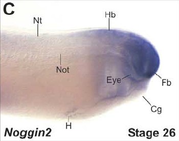 nog2 (noggin2) gene expression in Xenopus laevis embryos, NF stage 26, as assayed by in situ hybridization, lateral view, anteriorright, dorsal up.