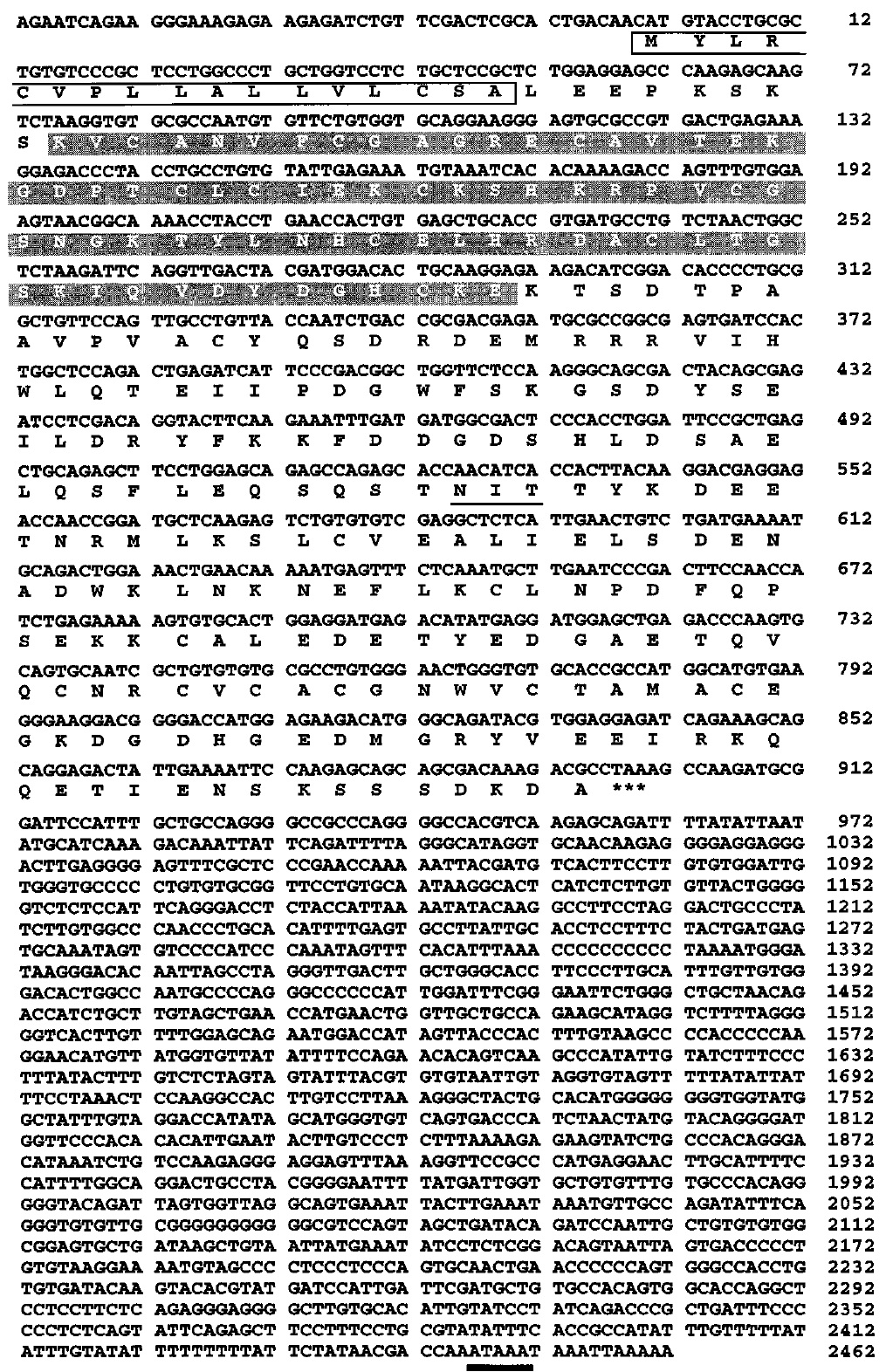 FIG. 1. Nucleotide and predicted amino acid sequences derived from Xenopus FRP cDNA clone. Numbering of nucleotides starts from the A of the initiation codon. The putative signal sequence at the NH2-terminus is boxed. The follistatin module is shadowed. A potential N-linked glycosylation site is underlined. The stop codon is indicated by asterisks and the polyadenylation signal is heavily underlined.