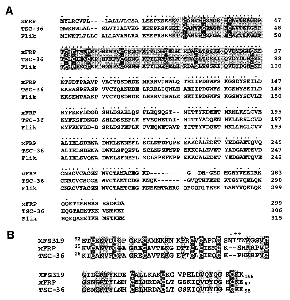 FIG. 2. (A) Alignment of the amino acid sequence of xFRP, TSC-36, and Flik. Identical residues are indicated by dots. The dash (2) represents a gap inserted for maximal alignment. The follistatin module is shadowed, and the included cystein residues are heavily shadowed. (B) Alignment of the follistatin modules of XFS319, xFRP, and TSC-36. Identical residues are shadowed. The potential N-linked glycosylation site of XFS319 is indicated by asterisks.