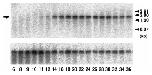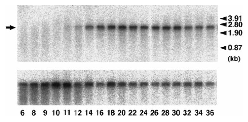 FIG. 3. Expression of xFRP mRNA during Xenopus development. Northern blot anaysis was performed using one mg of stagespecific mRNA per lane. The blotting membrane was probed with 32P-labeled xFRP cDNA (upper) or Xenopus ODC cDNA (lower). Arrow indicates xFRP. Embryonic stages are indicated by numbers according to Nieuwkoop and Farber [21].