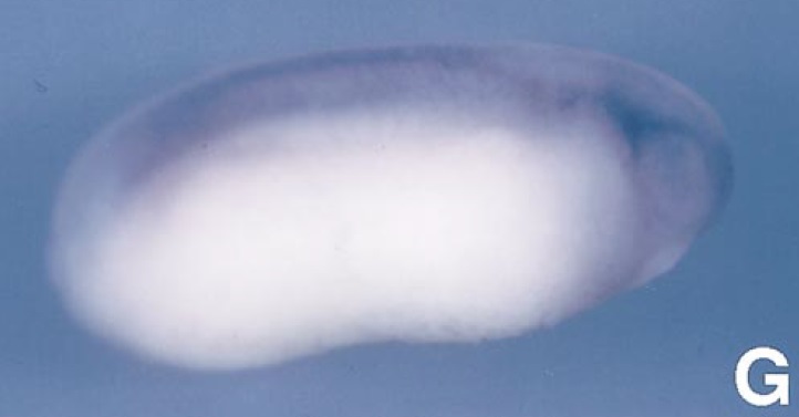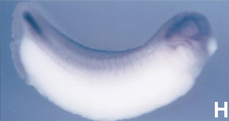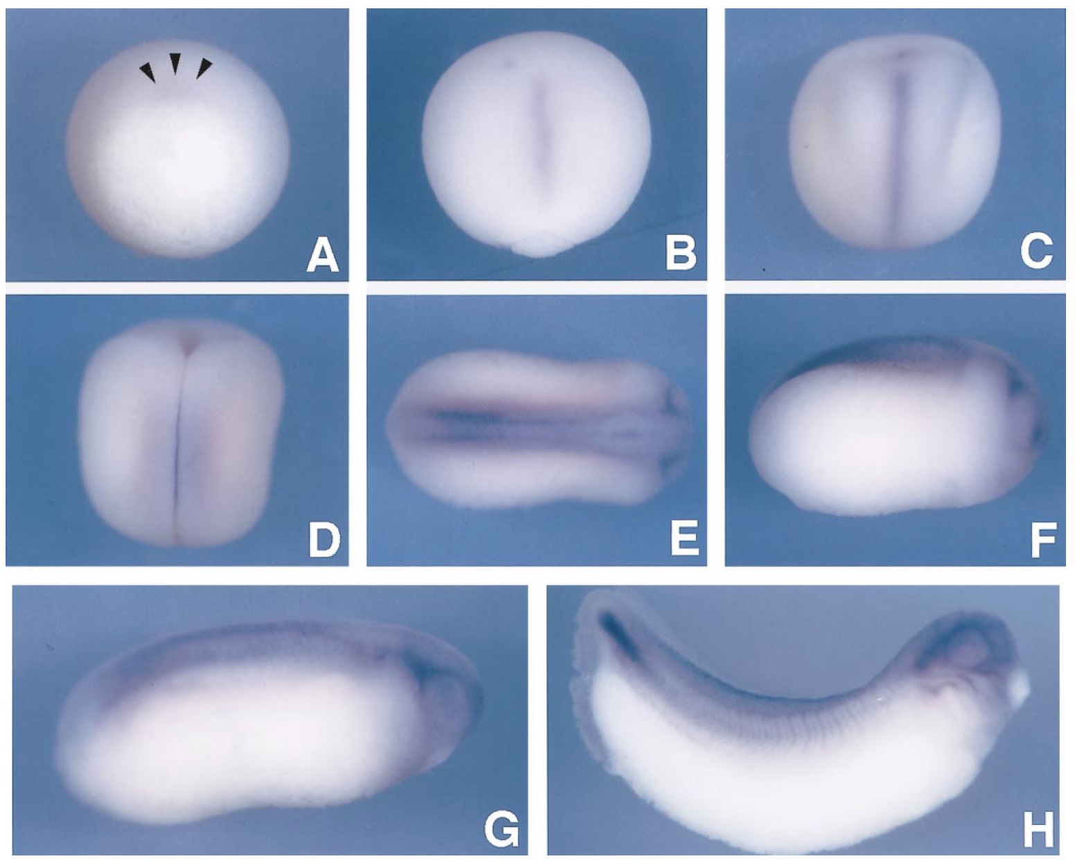 FIG. 4. Spatial distribution of xFRP mRNA during Xenopus embryogenesis. Whole-mount in situ hybridization was performed with DIG-labeled antisense xFRP RNA. (A) Stage 10 embryo, vegetal view. xFRP RNA was slightly detected in the organizer (arrowheads). (B) Stage 12 embryo, dorsal view. Signals were detected in prechordal and chordal mesoderm. (C) Stage 15 embryo, dorsal view. (D) Stage 18 embryo, dorsal view. (E) Stage 21 embryo, dorsal view. (F) Stage 21 embryo, lateral view. (G) Stage 24 embryo. (H) Stage 30 embryo.