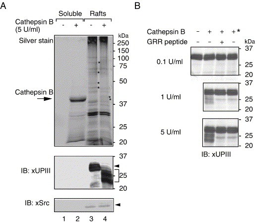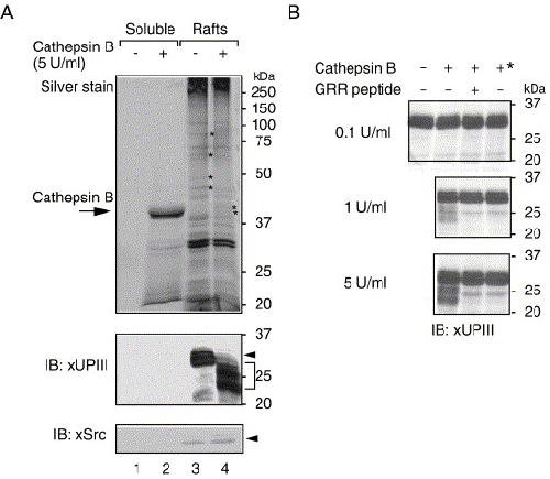 Fig. 2. Partial digestion of xUPIII with cathepsin B in vitro. (A) Raft fractions were prepared from unfertilized eggs and treated without (lanes 1 and 3) or with (lanes 2 and 4) cathepsin B (5 U/ml) for 30 min as described in Materials and methods. After the treatments, the raft fractions (5 μg/lane, lanes 3 and 4) and soluble components (lanes 1 and 2) were separated by ultracentrifugation and analyzed by silver staining or direct immunoblotting with anti-xUPIII or anti-xSrc antibody. In silver stain data, the position of cathepsin B in the soluble fractions is indicated. Asterisks indicate the positions of raft-associated proteins that decrease after cathepsin B treatment. In IB: xUPIII data, the intact 30-kDa xUPIII band, is indicated by an arrowhead, while bands of 21�27 kDa are indicated by a bracket. (B) Unfertilized eggs rafts (2 μg/lane) were treated for 5 min with different concentrations of cathepsin B in the absence or the presence of a synthetic xUPIII-GRR peptide (1 mM). The reaction mixtures were analyzed by direct immunoblotting with anti-xUPIII antibody. Cathepsin B + with an asterisk is heat-inactivated cathepsin B (95�C, 30 min).