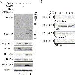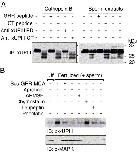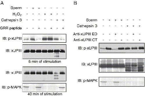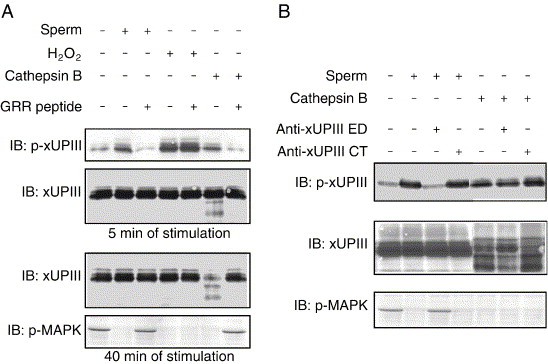 Fig. 3. Xenopus egg activation by fertilization or cathepsin B involves proteolysis of xUPIII. (A) Unfertilized eggs were untreated or treated with sperm (106/ml), H2O2 (10 mM), or cathepsin B (5 U/ml), in the absence or the presence of 1 mM xUPIII-GRR peptide. In upper two panels, 5-min activated egg rafts (10 μg/lane) were analyzed for tyrosine phosphorylation of xUPIII by immunoprecipitation with anti-xUPIII ED antibody followed by immunoblotting with PY99 (IB: p-xUPIII) and for proteolysis of xUPIII by direct immunoblotting with anti-xUPIII ED antibody (IB: xUPIII). In lower two panels, 40-min activated egg rafts (1 μg/lane) (in the case of H2O2 treatments, eggs were exposed to H2O2 for 5 min and then incubated without H2O2 for 35 min) were directly analyzed for proteolysis of xUPIII (IB: xUPIII). Non-raft samples (50 μg/lane) were analyzed for tyrosine phosphorylation of MAP kinase by immunoblotting with anti-phospho MAP kinase antibody (IB: p-MAPK). (B) Tyrosine phosphorylation and proteolysis of the raft-associated xUPIII (5 min post-activation) and tyrosine phosphorylation of the non-raft MAP kinase (40 min post-activation) were analyzed as in panel A by using egg samples that were activated by sperm or cathepsin B in the absence or the presence of antibody against either xUPIII ED or xUPIII CT (each at 1:10 dilution of serum).