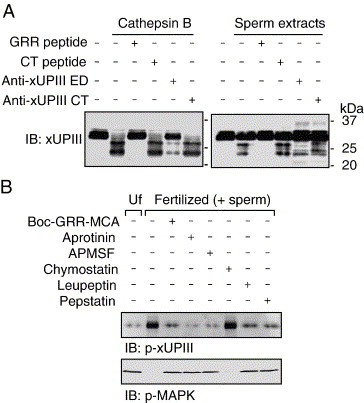 Fig. 4. Xenopus sperm possess protease activity toward xUPIII that is essential for tyrosine phosphorylation of xUPIII and egg activation. (A) In vitro proteolysis of the raft-associated xUPIII by cathepsin B or Xenopus sperm extracts. In the left panel, unfertilized egg rafts (2 μg/assay) were subjected to in vitro cathepsin B treatment (5 U/ml, 30 min) in the absence or the presence of one of the indicated synthetic peptides (each at 1 mM) or antibodies (each at 400 μg/ml). After the treatments, the raft fractions were collected and analyzed by immunoblotting with anti-xUPIII ED antibody. In the right panel, a similar experiment as in left panel was done with use of sperm extracts (1 mg/ml, 12 h). (B) Inhibition of sperm-induced egg activation events by a synthetic cathepsin B substrate and protease inhibitors. Fertilization was performed in the absence or the presence of several protease inhibitors: aprotinin (10 μM), APMSF (5 mM), chymostatin (1 mM), leupeptin (2 mM), or pepstatin (1 mM). In the upper panel, tyrosine phosphorylation of xUPIII was analyzed as in Fig. 1A using the raft fractions (10 μg/lane) prepared from 5-min inseminated eggs. In the lower panel, tyrosine phosphorylation of p42 MAPK was analyzed as in Fig. 3 by using non-raft samples (50 μg/lane) prepared from 40-min inseminated eggs.