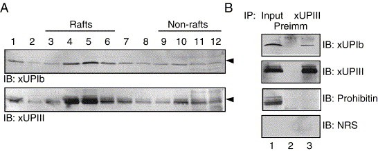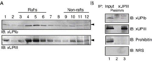 Fig. 5. Co-localization of xUPIII and xUPIb in the rafts of Xenopus eggs. (A) Unfertilized Xenopus eggs were subjected to raft preparation, and fractions obtained (no. 1�12, 20 μl/lane that is equivalent to about 5 eggs/lane) were analyzed by immunoblotting with antibodies against xUPIb or xUPIII. Arrowheads indicate the positions of each protein band. (B) Raft fractions (10 μg/lane) were solubilized by 0.1% SDS and immunoprecipitated with either preimmune serum (Preimm) or anti-xUPIII antibody. The immunoprecipitates were analyzed by immunoblotting with the antibodies indicated. Input, raft fractions (1 μg/lane). NRS, normal rabbit serum.