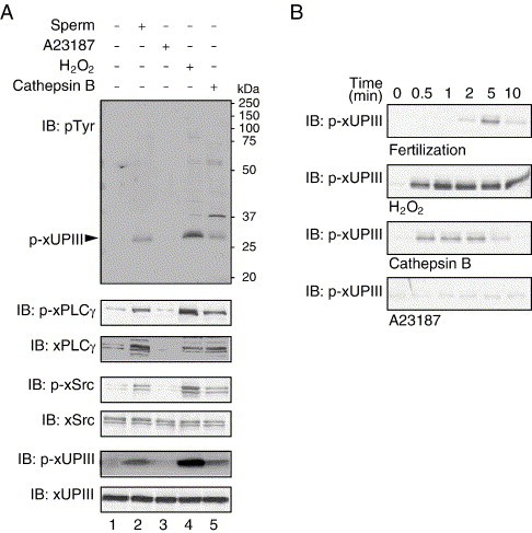 Fig. 1. Tyrosine phosphorylation of xUPIII in cathepsin-B-treated Xenopus egg. (A) Xenopus unfertilized eggs were treated for 5 min with none (lane 1), sperm (106/ml, lane 2), A23187 (0.5 μM, lane 3), H2O2 (10 mM, lane 4), or cathepsin B (5 U/ml, lane 5). Top panel shows tyrosine phosphorylation pattern for total raft proteins (5 μg/lane) as revealed by immunoblotting with anti-phosphotyrosine antibody, PY99 (IB: pTyr). Tyrosine phosphorylation as well as amounts of xSrc, xPLCγ, and xUPIII was analyzed by immunoprecipitation of the SDS-solubilized raft fractions (50 μg/lane) with antibodies against xSrc, xPLCγ, and xUPIII followed by immunoblotting with the homologous antibody or PY99. In the PY99 immunoblotting data, the position of the 30-kDa band, which is likely to be xUPIII, is indicated. Note that a small difference in the mobility of the 30-kDa phosphotyrosine-containing band in fertilized eggs, H2O2-activated, and cathepsin-B-activated eggs is not reproducible. Molecular size markers (20�250 kDa) are also shown. (B) Tyrosine phosphorylation of xUPIII (p-xUPIII) was analyzed as in panel A by anti-xUPIII immunoprecipitation and anti-phosphotyrosine immunoblotting of the SDS-solubilized raft fractions (50 μg/lane) of eggs that had been untreated (0 min) or treated for the indicated times (0.5�10 min) with sperm (106/ml, fertilization), H2O2 (10 mM), cathepsin B (5 U/ml), or A23187 (0.5 μM).