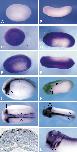 FIG. 3. Whole mount in situ mRNA hybridization of embryos at different developmental stages with xmdc9 and xmdc11a cRNA, and hybridization of a tailbud stage embryo section with xmdc11a cRNA. Albino X. laevis embryos at various developmental stages were hybridized with an xmdc9 sense probe (A, B), an xmdc9 antisense probe (C), or an xmdc11a antisense probe (G). All embryos are oriented with their anterior toward the left of the figure. A shows a lateral view of a late neurulaembryo (stage 20), and B shows a tailbudembryo (stage 30). Both embryos were hybridized with the sense xmdc9 control probe. C shows that xmdc9 expression can be detected in the entire gastrula stage embryo. In a neurulaembryo (E, stage 20) xmdc9 mRNA is present along the entire anteroposterior axis with a more pronounced staining on the dorsal side. At stage 25 (D), an essentially similar localization is observed in the head, the dorsal trunk structures and the tail bud. In addition, a more pronounced staining of the somites is visible. In a dorsal view of a tailbudembryo (F, stage 25), expression of xmdc9 appears strongest in dorsal structures. G and I show a lateral and dorsal view, respectively, of a late neurulaembryo (stage 20) hybridized with an xmdc11a antisense probe. The most anterior signal is divided into three populations of cells (arrows) extending from the neural tube. In the trunk, a thin line of cells on either side of the neural tube express xmdc11a (black arrowheads). K shows a transverse section through the trunk of a tailbudembryo (stage 22). Two rows of xmdc11a-expressing cells (small black arrowhead) extend along the sides of the neural tube (nt). The somites (s), gut (g), and notochord structures (nc) are also indicated. In a lateral view of a tailbud stage embryo (H, stage 25), xmdc11a staining is present in four groups of cells (arrows) within the head and branchial arches. J demonstrates that expression in the same anterior structures as in H can be seen in a dorsal view of a tailbudembryo. No xmdc11a expression is detected in the optic vesicle (J, red arrowhead). In the trunk, the staining clearly appears along two stripes on either side of the midline. L depicts a magnification of the anterior region of a tailbud stage embryo. xmdc11a mRNA is localized to the four segments derived from the cranial neural crest. From posterior to anterior, these structures correspond to the posterior branchial crest, the anterior branchial crest, the hyoid crest, and the mandibular crest. The optic vesicle is marked by a red arrowhead, and the brain is indicated (b).