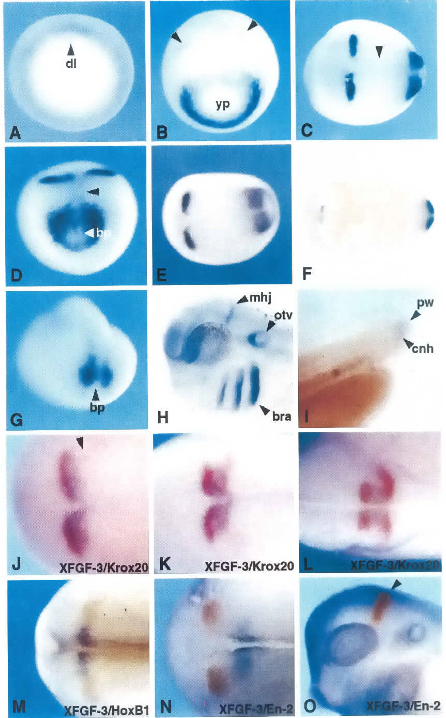 Figure 1. XFGF3 expression in the developing Xenopus embryo. (A) Vegetal view of an early gastrula stage embryo (st. 10.5): dorsal to the top. A faint staining IS detected in a complete ring around the blastopore with higher levels of expression visible dorsally. dl, dorsal blastopore lip. (B) Dorsovegetal view of a late gastrula stage embryo (st. 12.5) showing the periblastoporal expression of XFGF-3. Higher levels of XFGF-3 mRNA are present in the lateral and ventral aspects of the blastopore. Arrowheads point to the anterior stripe of expression that begins to be vIsible at this stage on each side of the neural plate. yp, yolk plug. (C-E) Early neurula stage embryos. (C,E) Dorsal views of a st13 and st 14 embryos, respectively (anterior to the left). Expression in the neural plate has become more prominent by this stage. A faint staining IS detected either side of the midline extending up to the anterior stripe (black arrowhead In C and D).(D) Posterior view of a st. 13 embryo showing XFGF-3 expression around the closed blastopore (bp). (F) Dorsal view of a cleared embryo at the end of the neurula stage (st. 20). The anterior stripe of XFGF-3 expression has become much narrower and has converged towards the midline, (G) Posterior view of a stage 20 embryo showing a strong expression in region lateral to the closed blastopore (bp) extending for some distance along the developing aXIS, (H,I) Tailbud stage embryo (St. 32). (H) Side view of the head region of a cleared embryo showing expression In the branchial arches (bra), in the OtiC vesicle (otv) and at the level of the midbrain/hindbrain junction (mhj). (I) Side view of the posterior region of a cleared embryo showing XFGF-3 expresslon in the tailbud in the chordoneural hinge (cnh) and in the postenor wall (pw) of the neurenteric canal. (J-L) Double whole-mount in situ hybridizations showing XFGF-3 and Krox 20 expression (blue and orange staining. respectively). (J) Early neurula stage embryo (st, 14). Krox 20 and XFGF-3 expression are found to overlap at the level of the prospectIVe rhombomere 3 of the hindbrain. At this stage Krox20 expression In the prospective rhombomere 5 IS only barely detectable (arrowhead), (K) Stage 15 embryo, XFGF-3 at this stage IS expressed in rhombomeres 3-5. (L) Stage 20 embryo. By the end of neurulation the domain of XFGF-3 expression has narrowed, being restricted to the prospectIVe rhombomere 4 (M) Double whole-mount In Situ hybridization showing XFGF-3 and HoxB1 (orange staining) expression In a stage 17 embryo. HoxB1 band of expression identity the prospective rhombomere 4. (N,O) Double whole-mount in situ hybridization showing En-2 (orange staining and XFGF-3 expression. (N) Neurula stage embryo (st. 16). Throughout neurulation the band of XFGF-3 expression lies posterior to that of En-2. (O) Side view of a tailbud stage embryo (Sf. 30). By tailbud stages XFGF-3 expression in the hindbrain has disappeared while a new domain of expressIon has arisen at the isthmus (arrowhead) that overlaps wIth that of En-2