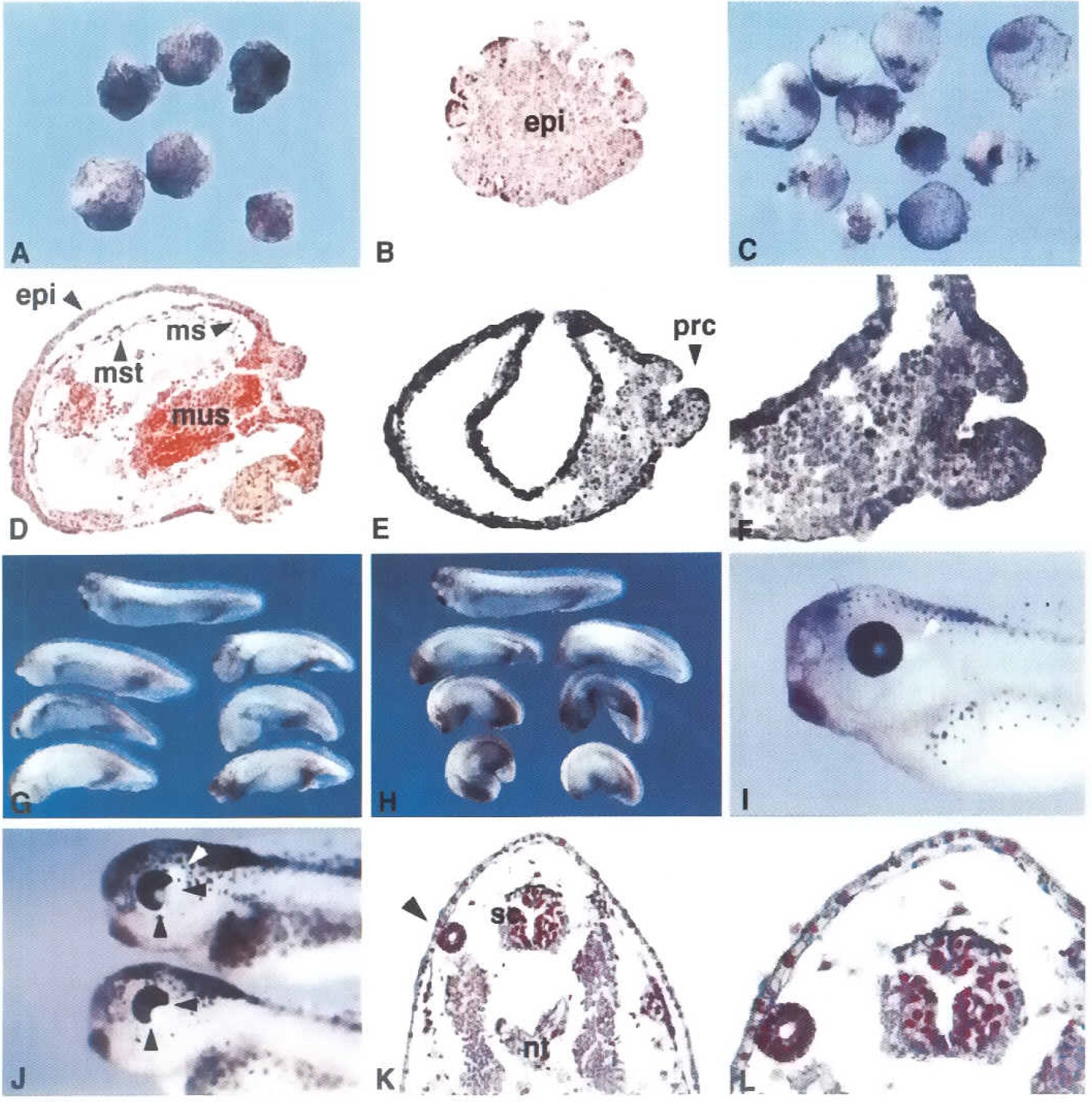 Fig. 2. Effects of XFGF-3 overexpression. (A,C) Whole animal caps after three days In culture. (B,D) Sections of such animal caps. (A. B) Controls; (B,C) Induced animal caps from embryos that had been injected with 28 pg of XFGF-3 mRNA. epi, epidermis: ms, mesenchyme: mst mesothelium. mus, muscle. (E) Induced animal cap from an embryo injected with 14 pg of XFGF-3 mRNA showing a proctodeum like structure (prc), (F) High magnificatIOn of the same animal cap. (G)Top embryo is a control while the bottom six embryos have been injected with 35pg of XFGF-3 mRNA at the 2-cell stage. (H) Top embryo IS a control while the bottom six embryos have been Injected with 70pg mRNA at the 2-cell stage. (I,J) PBS or XFGF-3 soaked beads were implanted close to the left optiC vesicle of late neurula stage embryos. (I) The presence of the PBS bead (arrowhead) did not have any effect on the development of the eye of control embryos. (J) XFGF-3 beads affected the differentiation of the pigmented epithelium of the eye. Black arrowheads Point to the wide region of the pigmented epithelium where pigmentation IS absent. White arrowhead paints to the position of the implanted XFGF-3 bead. (K) Transverse section at the level of the trunk of a stage 40 embryo which had an XFGF-3 bead Implanted posteriorly at the early neural plate stage. The presence of the XFGF-3 bead has induced the formation of an ectopic otic vesicle (arrowhead),Sc spinal cord: nt, notochord. (L) Higher magnification view of the same specimen.