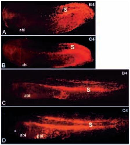 including the anterior VBI (abi) is unlabeled. (C) B4-labeled, stage