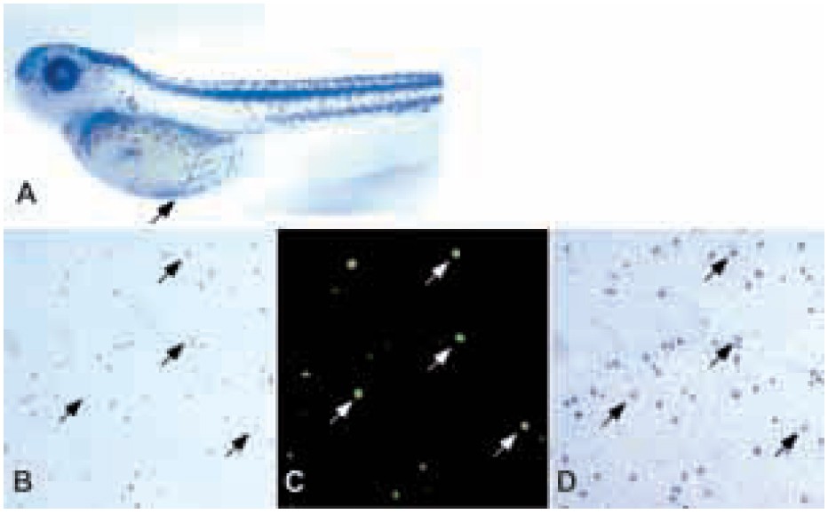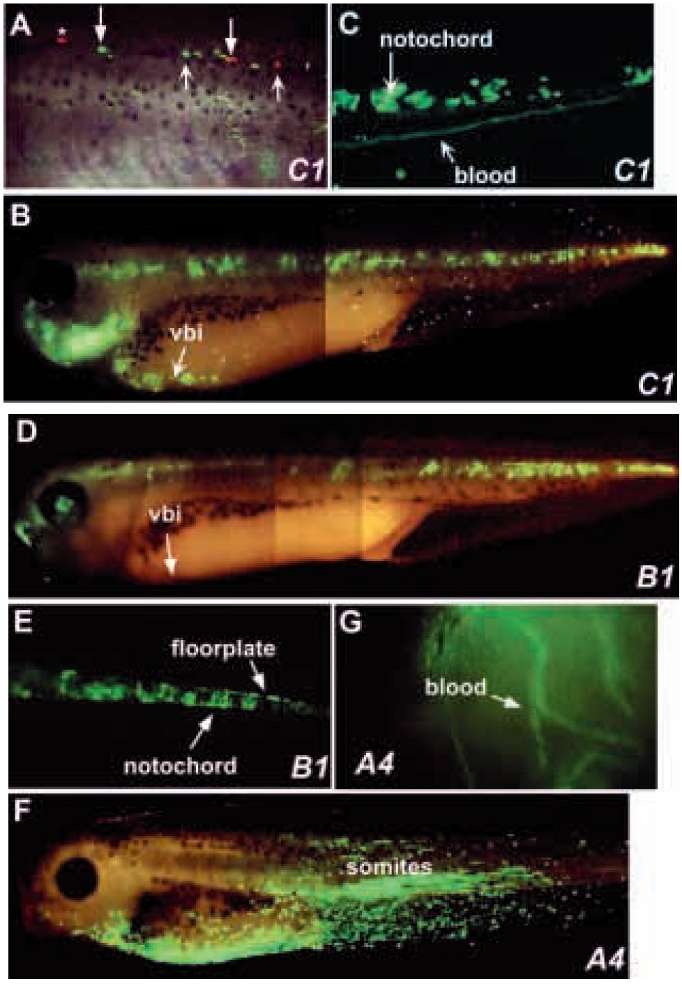 all images. (A) GFP-expressing blood cells in the tail of a C1-injected embryo.