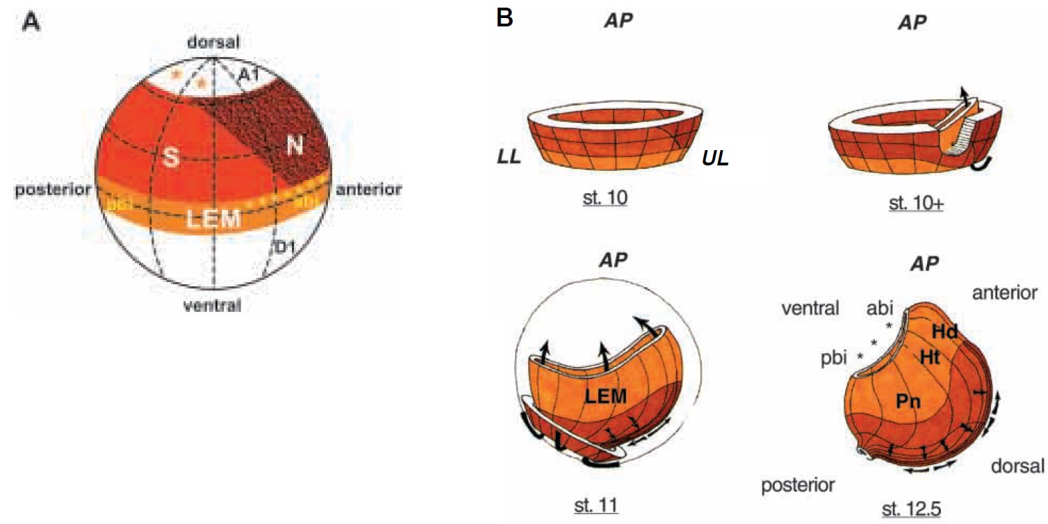 in a fixed position. Dorsal mesoderm is red and leading edge mesoderm (comprised of head, intermediate and lateral plate mesoderms) is
