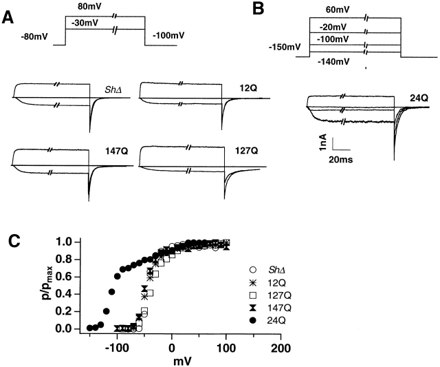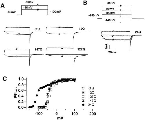 Figure 1. Voltage sensitivity of gating in mutants 12Q, 127Q, 24Q, and 147Q, compared with ShΔ. (A) Macroscopic currents from inside-out patches in steps from −80-mV holding potential to −30 and +80 mV, respectively, returning to −100 mV. Leak holding potential was −120 mV. Note, similar kinetics of activation and deactivation for 12Q, 127Q, 147Q, and ShΔ. (B) Macroscopic currents for the 24Q mutant. Due to the marked left shift in Po(V) curve for this mutant (C), holding potential was −160 mV for this mutant and currents at four test potentials are shown here (see pulse protocol insert). At −140 mV, no significant current is seen. Inward currents occur at −100 and −20 mV, with outward current at +60 mV. Leak holding potential was −160 mV. (C) Normalized voltage dependence of channel open probabilities for 12Q, 127Q, 24Q, and 147Q, as well as for control ShΔ.